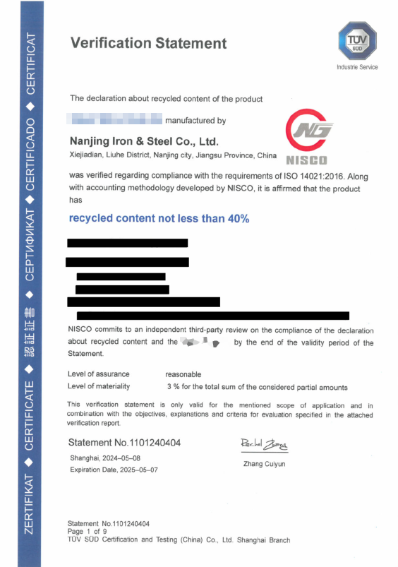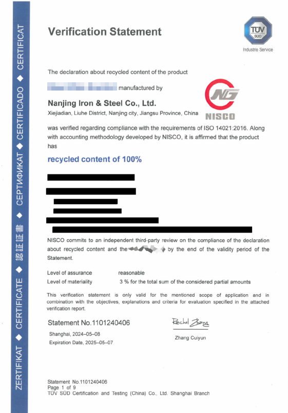 近日,南鋼某線材高端產品順利通過第三方權威認證機構TUV南德認證,獲得ISO 14021再循環含量認證證書。本次認證范圍涵蓋了40%以上、60%以上和100%高廢鋼比例生產的某線材高端產品。此項認證的獲得不僅是對南鋼環保理念和實踐的認可,更對企業綠色競爭力和可持續發展產生積極的影響。