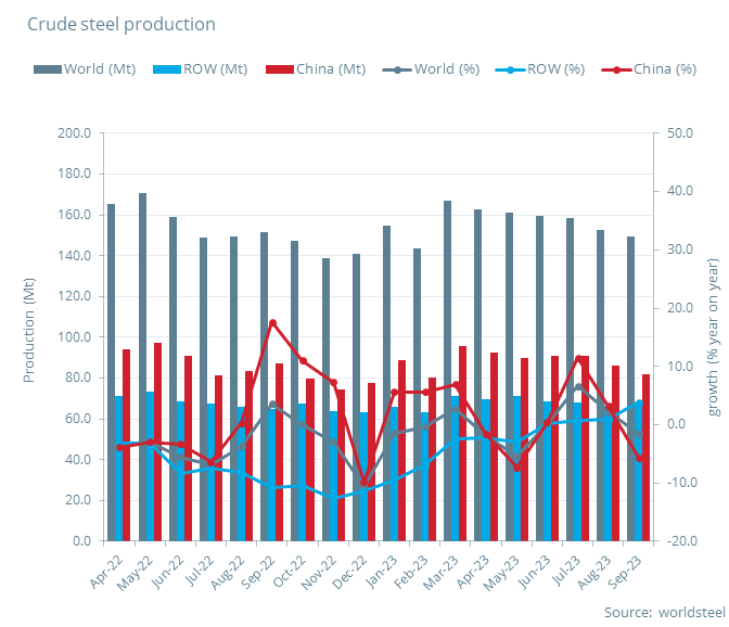2023年9月全球63個納入世界鋼鐵協會統計國家的粗鋼產量為1.493億噸,同比下降1.5%。