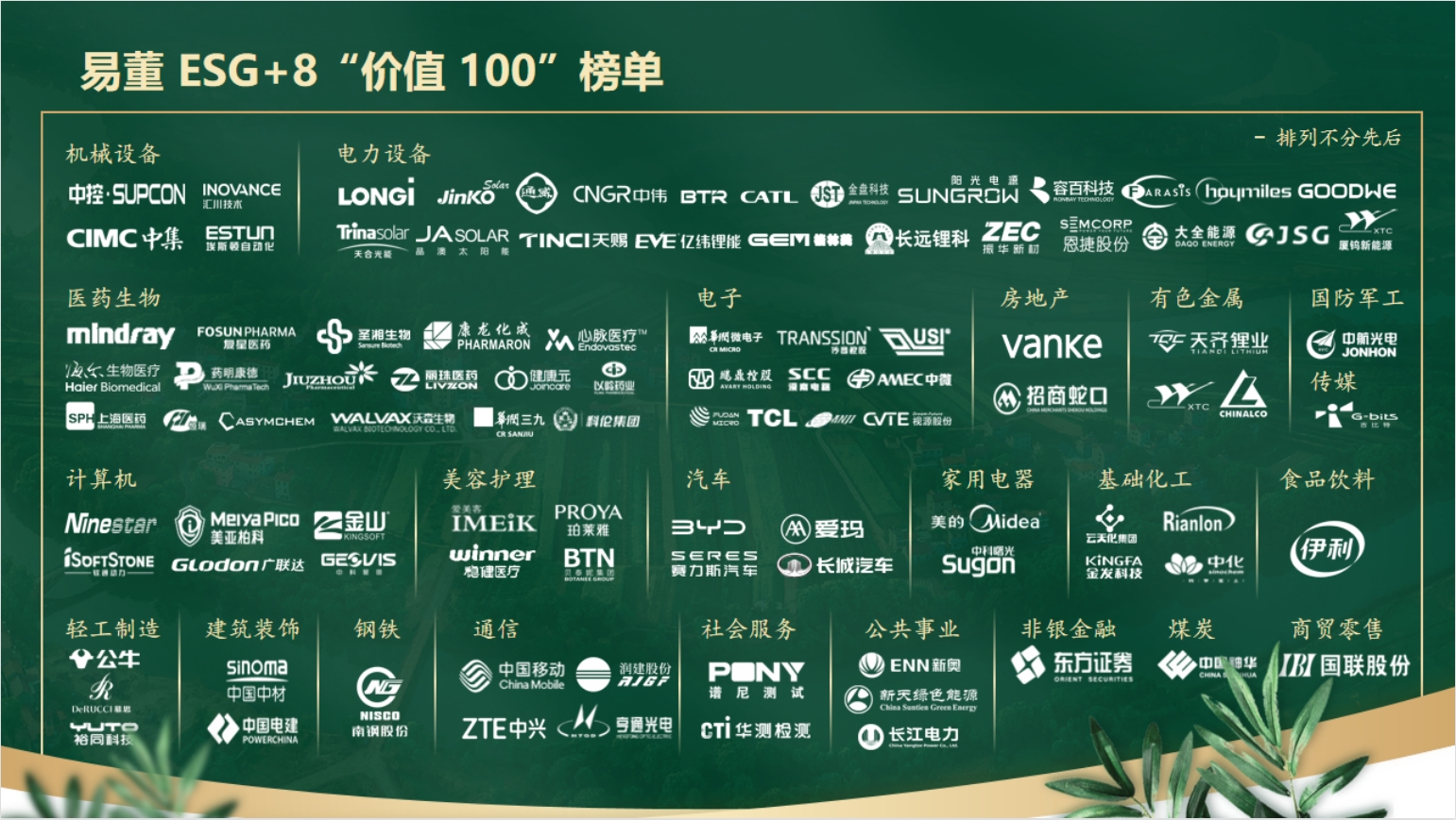 由價值在線、易董構建的獨具特色的中國公司ESG+8價值評級體系已覆蓋A股5332家上市公司主體,依據11個維度、70個議題、500+標準化指標、2000+數據點等多個底層數據,篩選出各行業ESG表現最佳的上市公司,共計100家。南鋼股份憑借易董ESG+8價值“AA”評級成為鋼鐵行業唯一進入該榜單的企業。