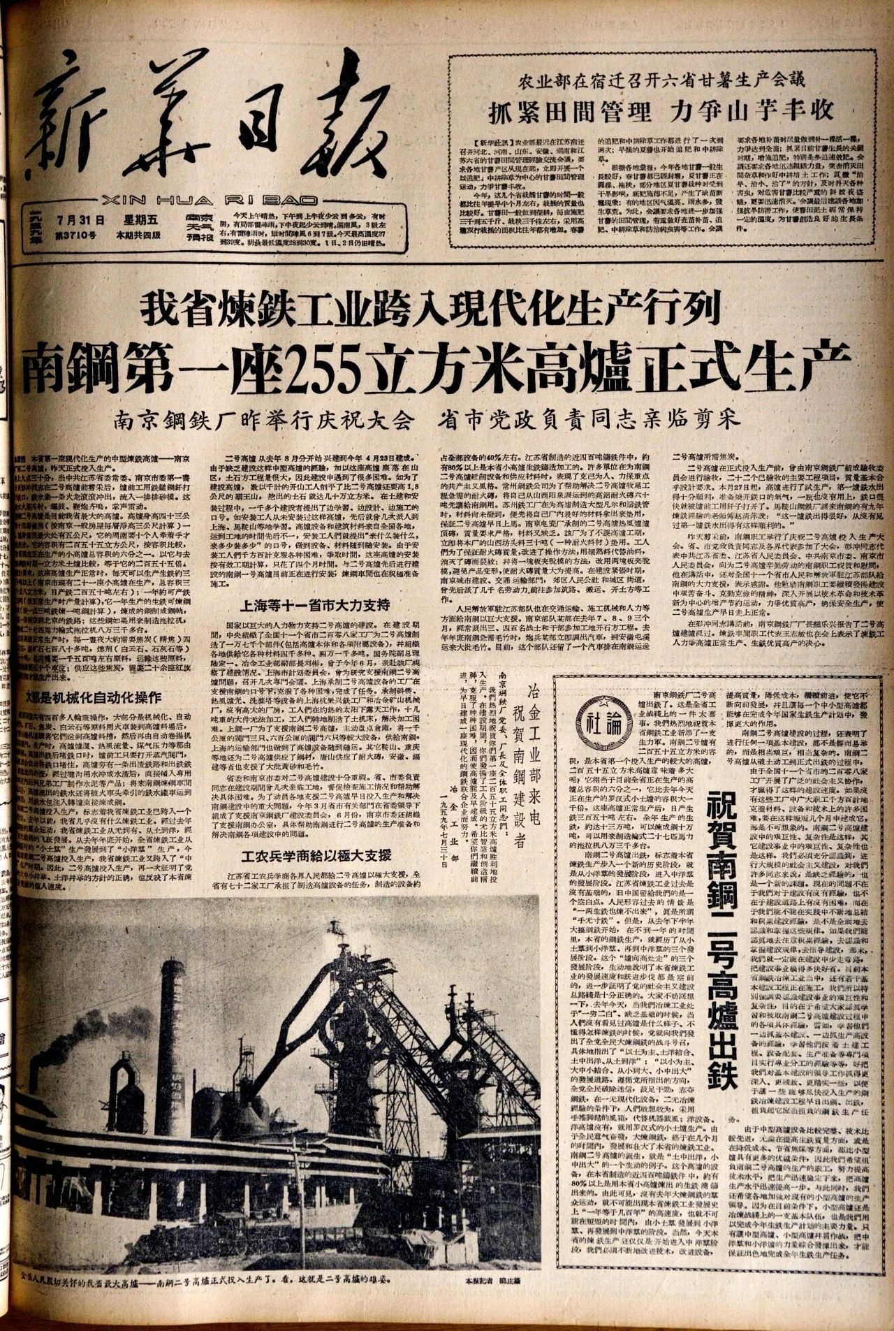 1959年,南鋼2號高爐出鐵,結束了江蘇省沒有現代化高爐煉鐵的歷史。《新華日報》頭版整版報道南鋼2號高爐建成投產。
