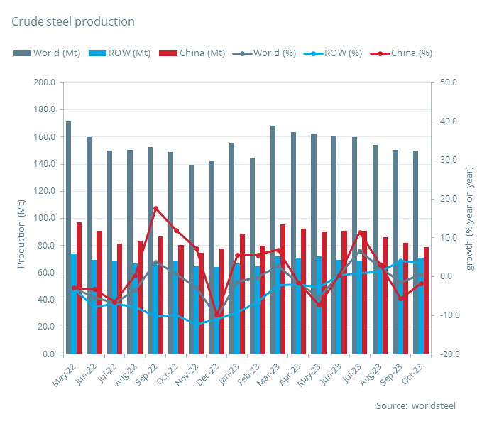 2023年10月,全球71個納入世界鋼鐵協會統計國家或地區的粗鋼產量為1.500億噸,同比增長0.6%。