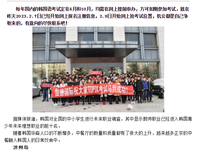 版權所有:山東恒德國際經濟技術合作有限公司 威海恒德職業培訓學校 地址:威海市高區火炬路153號-A 免費熱線:4006150009電話:(韓國部)+86-631-5672008(日本部)+86-631-5672006 (新加坡)+86-631-5672009 (留學部)+86-631-5672011 傳真:+86-631-5672028 郵 編:264209 郵箱:hengdeguoji@163.com51La| 策劃制作:威海雷迅網絡 魯ICP備19060589號 魯公網安備 37100302000191號